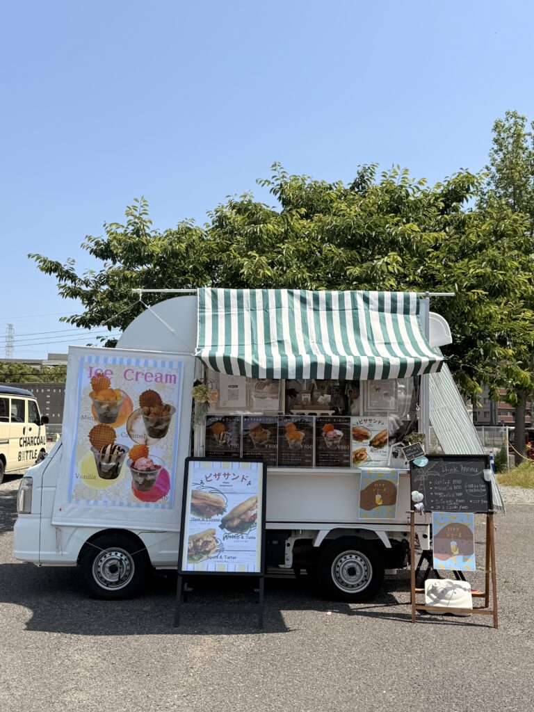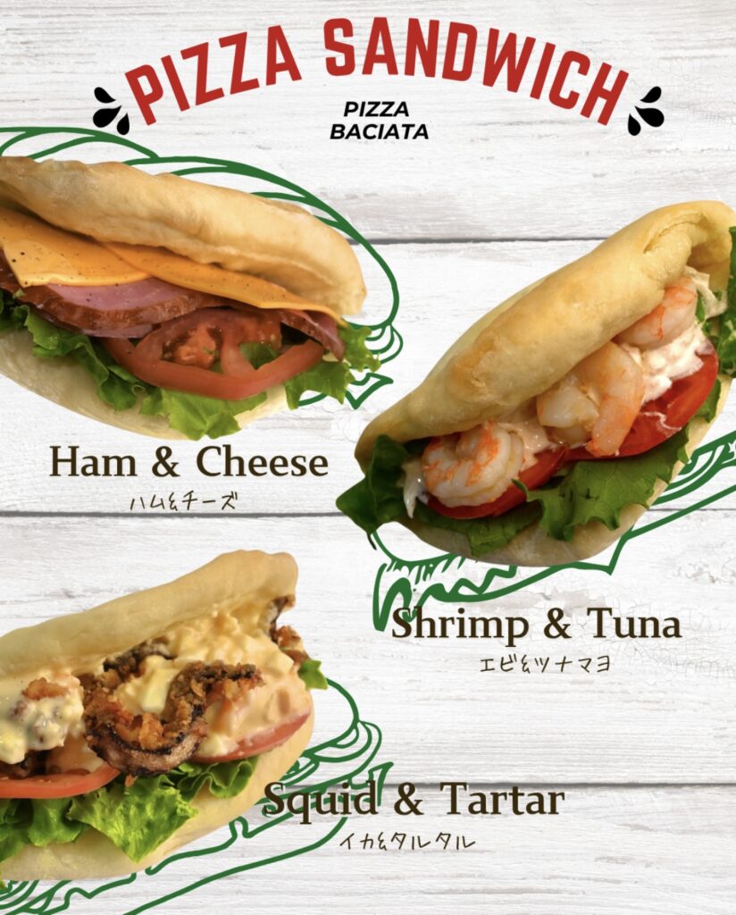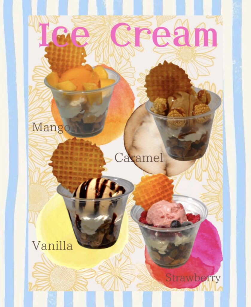 ピザサンド、アイスクリーム、バナナジュース、ソフトドリンク