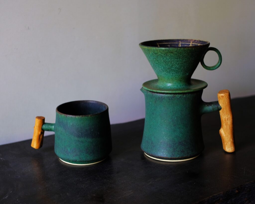 色彩豊かで落ち着きのある金属色や明るいターコイズブルーまで様々なシーンに合わせて選んでいただけるうつわを成作しています。通常の器だけでなく木の持ち手の珈琲セットや寂びを表現した苔玉置き・植木鉢など他にはない特徴のある作品で世界観を表現しています。