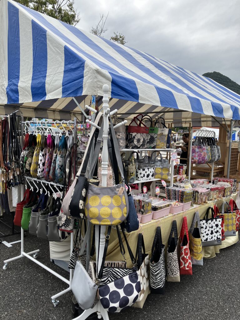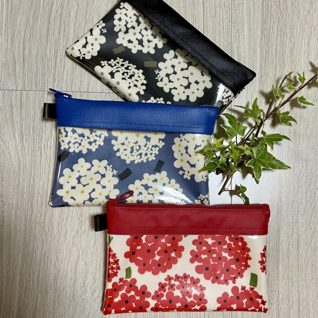 ラミネート加工生地で作成したバッグや小物を沢山お持ちします。