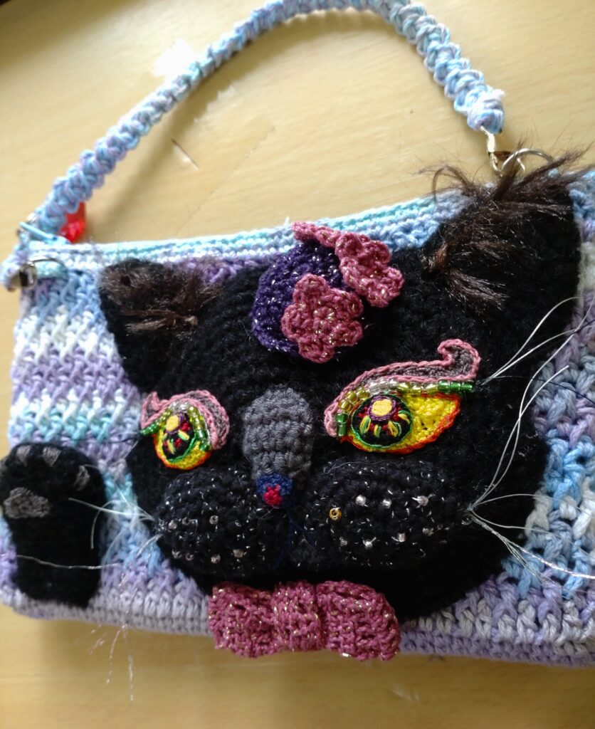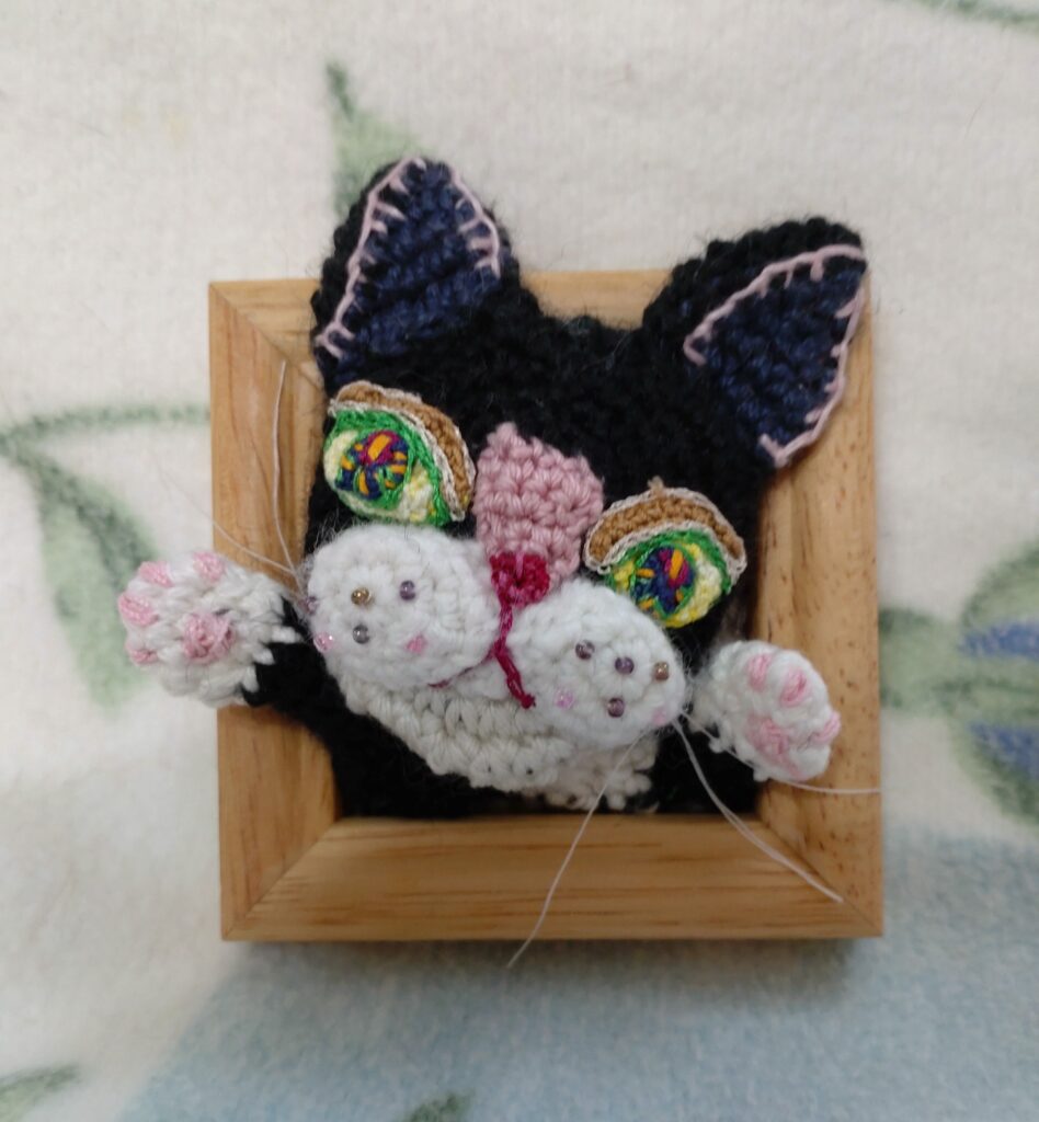 動物を毛糸等で編んで3Dアートの額縁にしたりスマホケースや小物入れ、又アクセサリーを作ります。特徴は目を編んで表情を出します