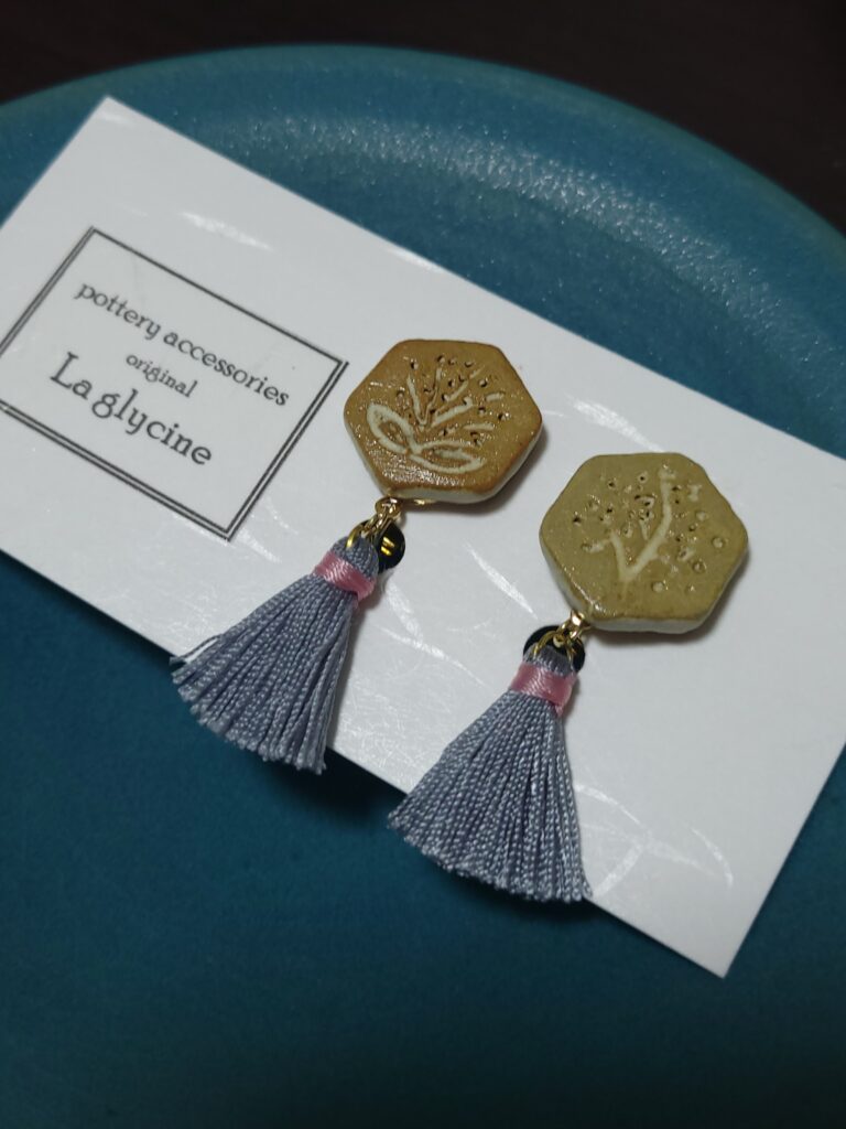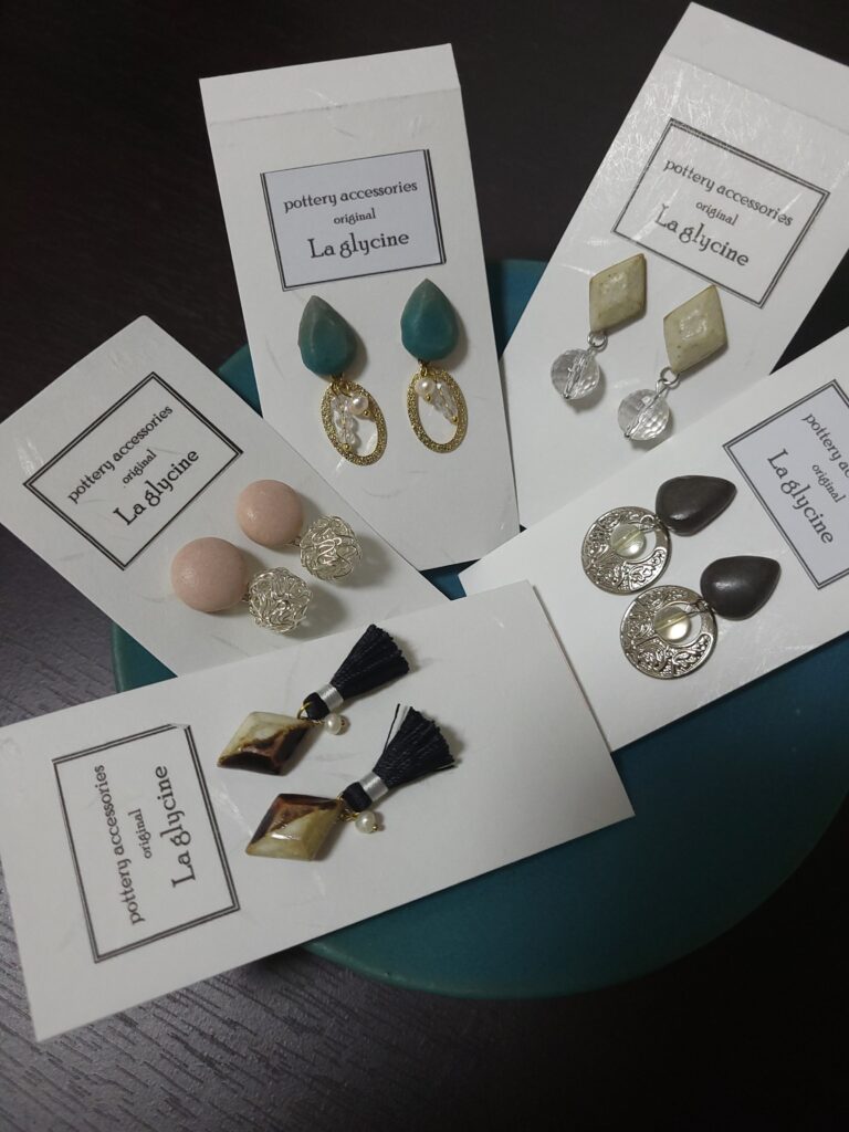 陶芸作品でアクセサリーを作成しています。ひとつずつ釜で焼き上げたパーツ(型どり~素焼き~乾燥、削り~釉薬~本焼き~パーツ付け作業)と作り上げるまでかなり時間がかかりますが唯一無二のアクセサリーを作っています。