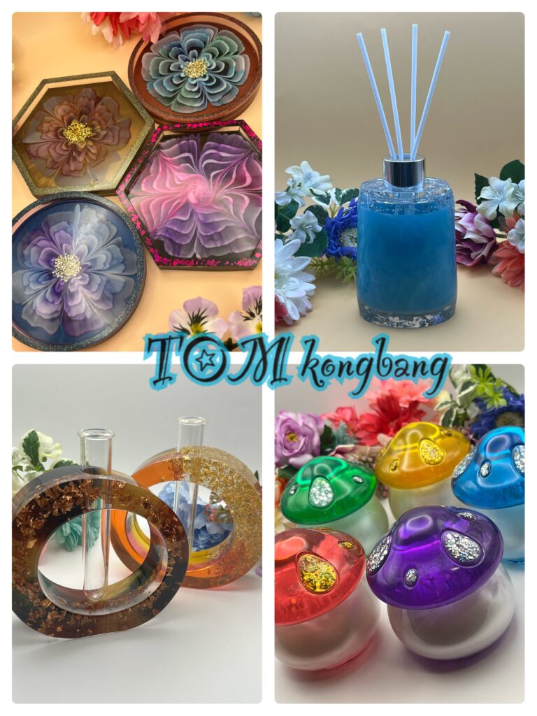 エポキシレジンを使って色々な作品を作ってます。一輪挿しやディフューザー、キャンドルホルダー等のインテリア雑貨やアクセサリートレイやレジンアートを用いた作品、ヘアアクセサリーやキーホルダーも作っています。
